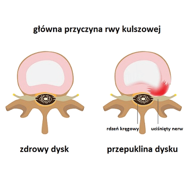 Najczęstsze przyczyny rwy kulszowej to przede wszystkim: choroby zwyrodnieniowe kręgosłupa, wady kręgosłupa oraz dyskopatia, czyli właściwie już choroba cywilizacyjna, na którą nierzadko cierpią już 30-latkowie, o osobach starszych nie wspominając. Właśnie zmiany w dyskach są statystycznie główną przyczyną rwy kulszowej. Wypuklina jądra miażdżystego lub jego przepuklina nie dość, że same z siebie są bolesne, to dodatkowo mogą uciskać nerw kulszowy, stanowiąc przyczynę bolesnej rwy kulszowej.